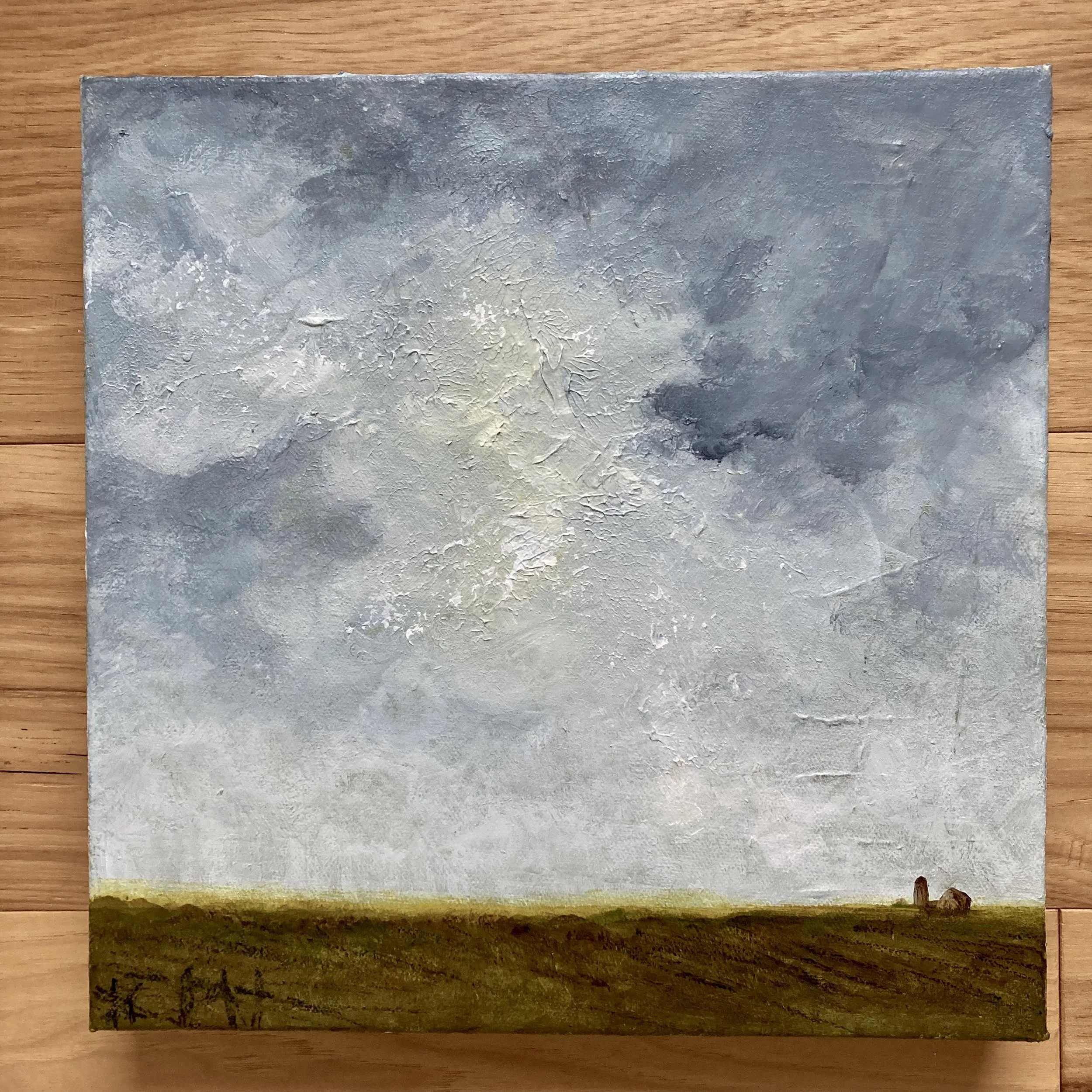 A had a painting that was similar to this one in a show recently. It sold rather quickly so I thought I’d dig into the theme of big sky once again, with the fields and that homestead below.
